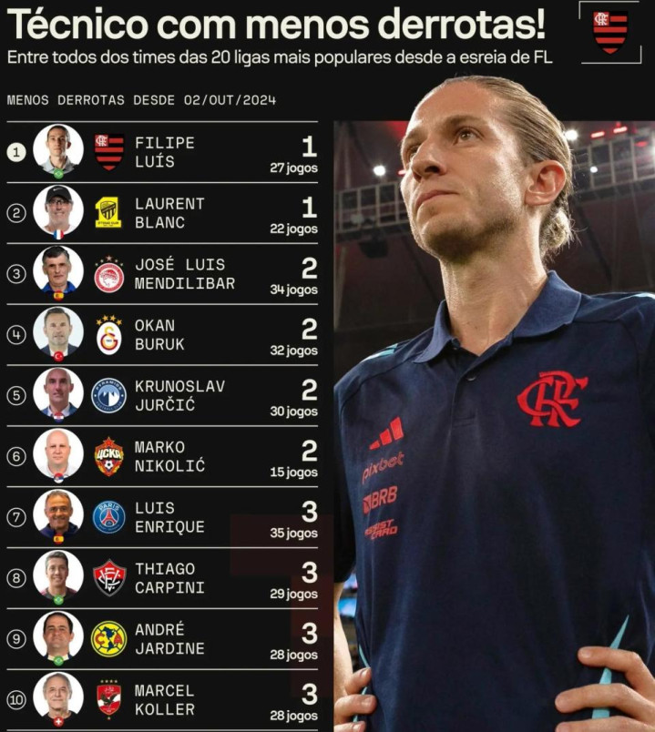 在战术层面,菲利佩-路易斯融合了欧洲先进足球理念,打造出一支攻守兼备的球队。本赛季巴甲联赛中,弗拉门戈以11战7胜3平1负的优异表现位居积分榜首位,其进攻与防守数据均位列联赛前列。球队既能通过高压逼抢和控球战术掌控比赛节奏,又能在防守端展现出极强的抗压能力,整体表现极具竞争力。